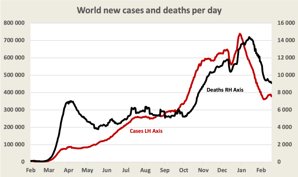 In early January it appeared that the rate of infection was falling quite significantly, but that fall seems to have stopped. Cases in the UK and the USA have continued to fall, but they are rising strongly in eastern Europe. Germany and Italy have imposed very tough movement restrictions.