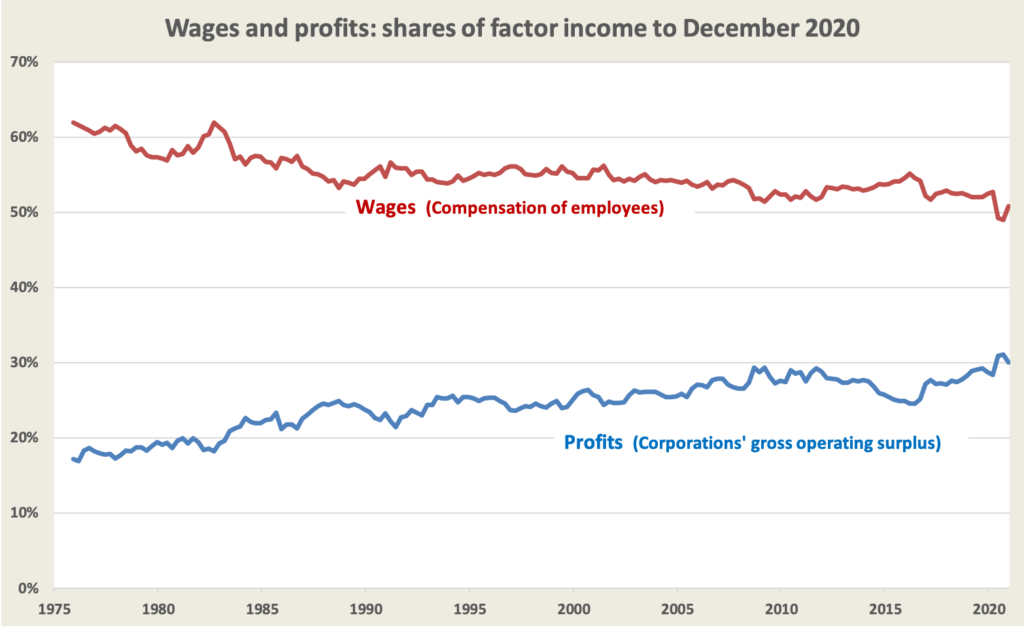 In the June and September quarters wages fell below 50 per cent of GDP for the first time since the ABS has been keeping detailed national accounts, before clawing their way back to 50.1 per cent in the December quarter. Usually in a recession counter-cyclical spending sees some boost in wages, but not in this one. It has been a good recession for corporations: the 45-year trend for profits to rise at the expense of wages is unbroken.