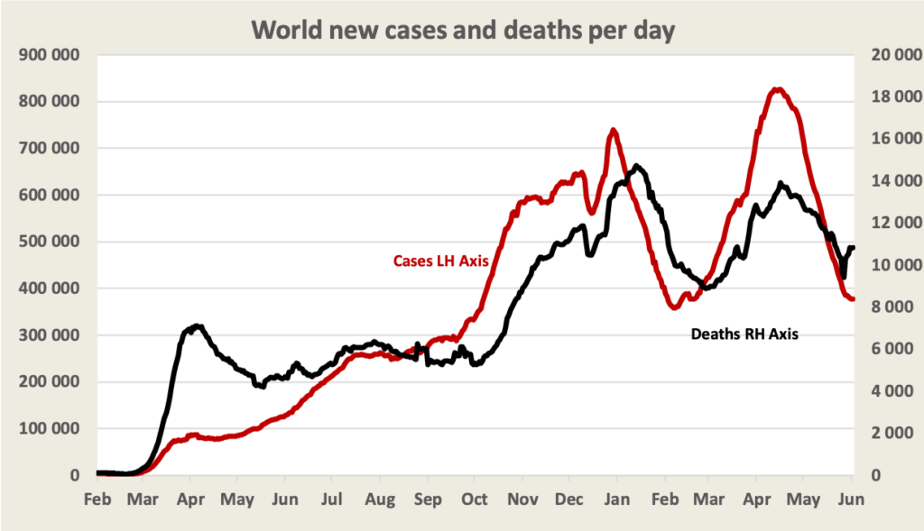 Worldwide recorded cases continue to fall, but deaths have been rising recently. Two countries, India and Brazil, now account for 40 per cent of the world’s new cases, and while cases in India are falling, they continue to run at a high rate in Brazil (300 daily cases per million population).