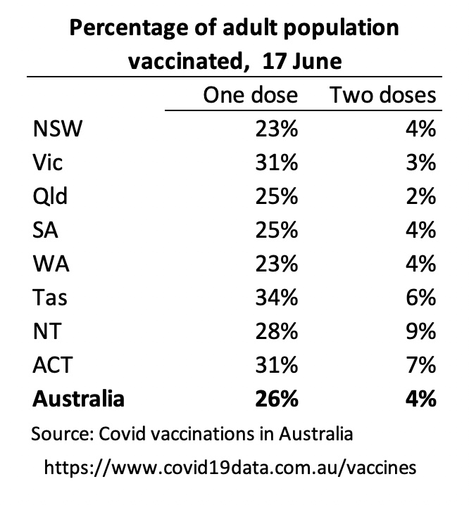 So far, only around 4 per cent of our population has received two doses of vaccine. Vaccination rates are particularly low in Western Australia. where the state government has capitalized on its geography to pursue aggressive elimination, and in New South Wales, where the state government has been reluctant to lock down Sydney or the whole state and has been less than rigorous in enforcing safety among workers exposed to incoming travellers. See the table below for state-by-state vaccine rates.