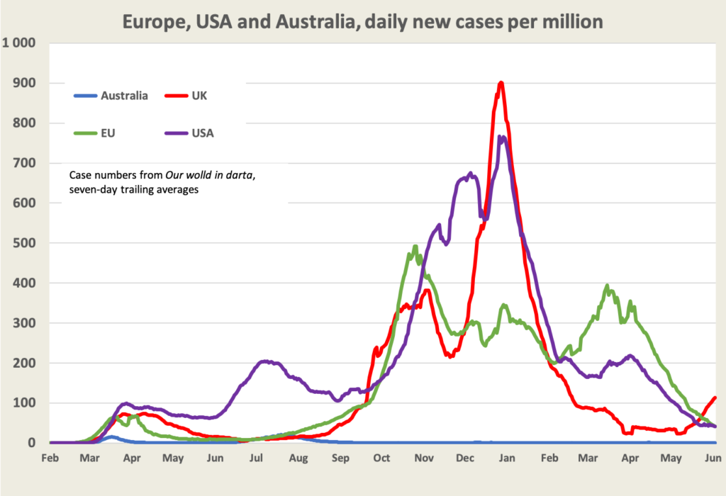 In all EU countries, with the exception of Spain and Portugal, cases are falling. In the UK, after having reached low levels, cases are rising once more. In the UK, Spain and Portugal the daily case rate is now around 100 per million population: that’s a little below Melbourne’s peak last August.