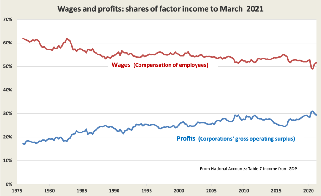 The broad picture of wages is revealed in our national accounts, from which we have constructed the following graph of wages and profits as a share of GDP. The current assaults on wages are simply the latest manifestation of an almost 50-year trend.