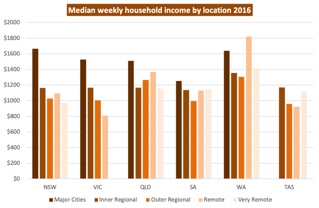 The chart above, constructed from the Grattan data, shows how incomes vary by region on a remoteness scale, and may have something to do with the political disillusionment in the bush: those living in big cities do far better than those in more remote regions. (Data for Queensland and WA is influenced by the presence of the mining industry.)