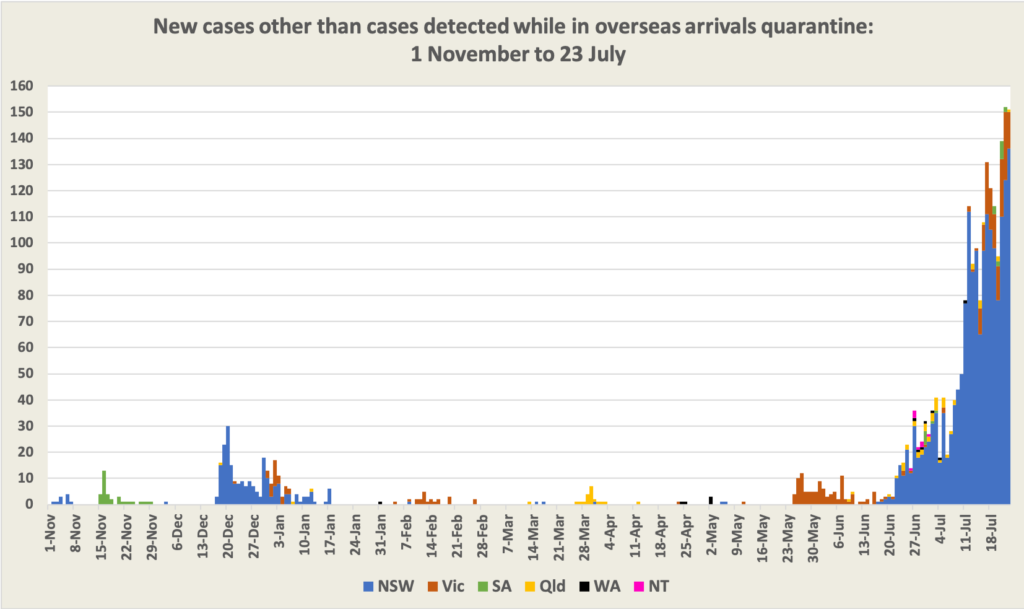 It is still growing exponentially in New South Wales, however. Although the virus is a more contagious variant than the one circulating in Victoria last year, its growth rate so far has been lower. With strong measures it should still be possible to bring it back to zero. If the people of Melbourne could endure the pain of a prolonged lockdown surely the people of Sydney can, and if the Victorian Government could ignore the petulant and uninformed voices of so-called “business interests” surely the New South Wales Government can.