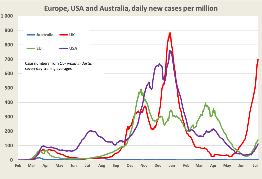 Because world figures show little change we won’t bother with the world graph, but the Europe-USA graph is revealing – of the UK folly of opening up prematurely when only 54 per cent of the population is “fully” vaccinated. So far deaths have not risen sharply, and maybe they won’t if that 54 percent covers most of the vulnerable groups. But there will inevitably be regional pockets of unvaccinated groups, and so long as the virus is raging even more powerful mutants have a chance to develop. On Thursday’s Coronacast Norman Swan went into more detail of how the UK situation may play out. It’s not very attractive.