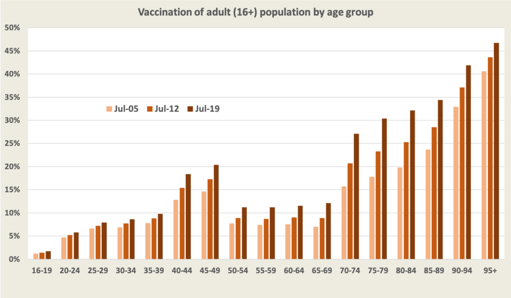 The most telling part of these figures is that only 14 per cent of the adult population is vaccinated. Even among the 70+ group only 31 per cent are vaccinated: we haven’t achieved a significant vaccination level even among our oldest group.