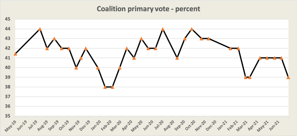 The Coalition’s support has been more volatile, falling from 41 per cent at the election to around 40 per cent now. That’s much less than Labor’s gain, but in the election the Coalition did well from a strong preference flow from Clive Palmer’s UAP who won 3 per cent of the vote.