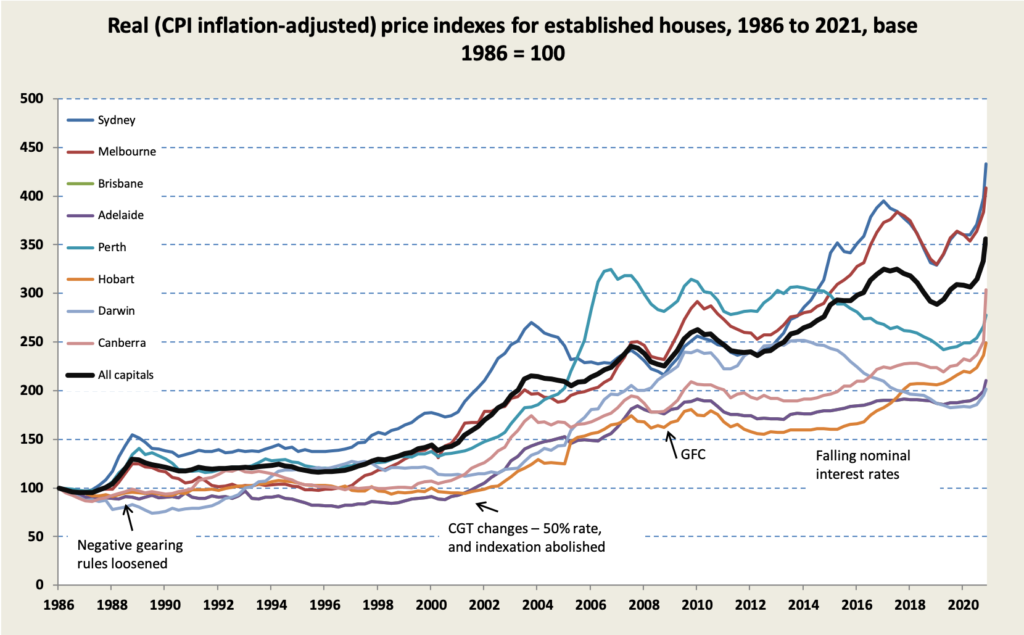 The second is also of established house prices, going back to 1986, and adjusted for CPI inflation, with annotations pointing to policy changes and developments that have contributed to housing price inflation.
