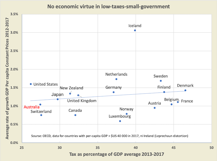The graph below, drawn from OECD data, takes a macro perspective of tax cuts. It shows for high-income countries the relation between taxes and economic growth: it certainly does not support the idea that high taxes impede economic growth – look at the upward slope of the line of regression. Australia is down in the low-tax-low-growth corner, and it appears that the Dutton-Morrison Government wants to push us even further into that corner.