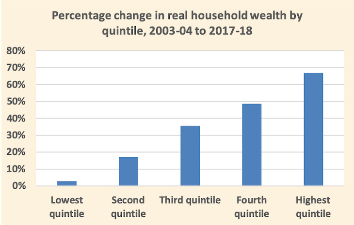 The real story, however, is about wealth inequality, which has risen strongly. If a society starts with a skewed distribution of income favouring the well-off, then even if income distribution does not change, it’s almost certain that wealth inequality will widen, and that’s what has happened. Over this century so far wealth inequality has widened; the poorest 20 per cent of households have seen no rise in wealth, while the top 20 percent have enjoyed a 67 percent rise in wealth.
