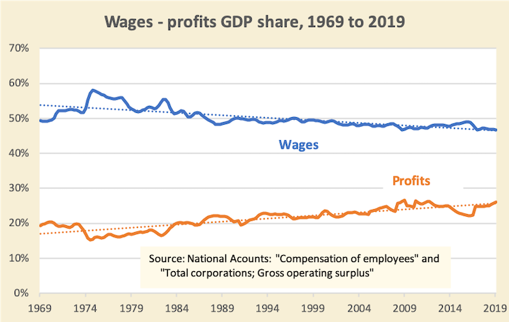 The steady drift in Australia’s wages-profit share of GDP is shown below.