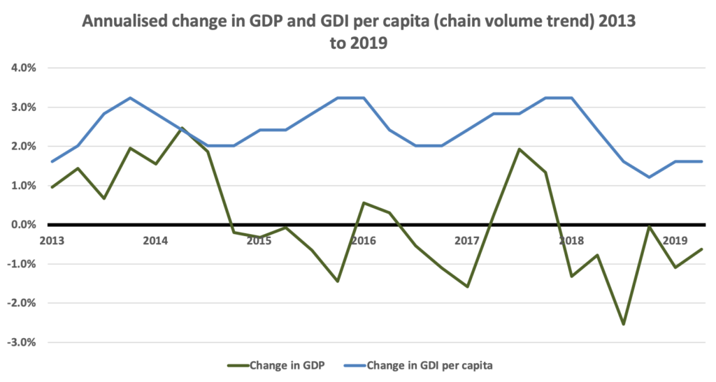 The trend is clearly downwards, and in the absence of structural reform (we lost our chance when we re-elected the Dutton-Morrison Government), there is no reason for it to pick up any time soon. In other words, this non-recession could last for some time.