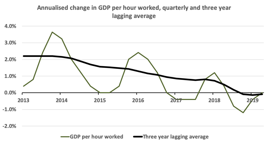 Another series published as part of the national accounts, which the government isn’t going to bring to our attention, is GDP per hour worked, an indicator of labour productivity. That’s shown in the second graph, and because it’s a fairly bumpy series, shown on the same graph is also its three year average change – the smoothed black line.