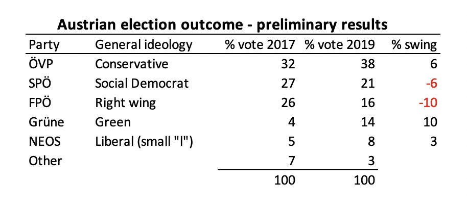 In part the outcome could be seen as a swing from one right-of-centre party (the FPÖ) to another on the right (the ÖVP). The FPÖ had disgraced itself in a sting operation in which Vice Chancellor Strache appeared to be accepting bribes from a supposed Russian oligarch. That’s what brought on an early election. Austria also seems to be following a pattern observable in other European democracies – strengthening support for greens parties, growing support for pro-business but socially-progressive parties, and a poor showing for traditional social democratic parties who had been the dominant force in postwar Europe.