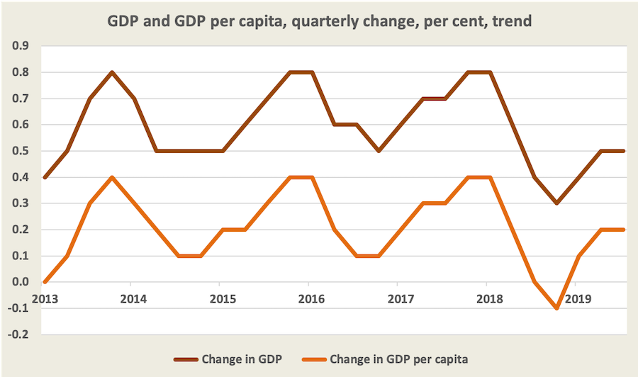 It’s hard to see what anyone in the Morrison Government has to crow about. The graph below shows trend growth in GDP and in per-capita GDP, the difference being accounted for by population growth. There was no pickup in either series. In the September quarter 2018 our real GDP per capita was $18 694; in the September quarter this year it has risen by $19 to $18 713. That’s almost enough to buy a copy of The Telegraph each week to read Frydenberg’s account of how well the economy is travelling.