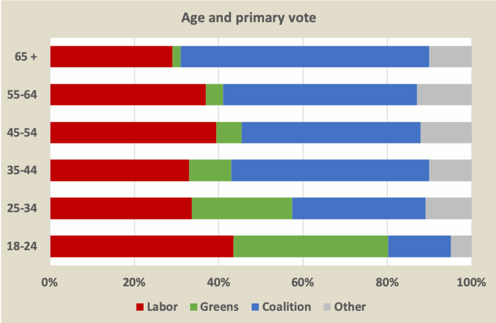 Analysis of the AES data suggests that over time the intergenerational divide is hardening. This is confirmed by William Bowe, who has dug into the analytical data and has found that between the 2016 and 2019 elections, voters aged 18-34 have swung heavily away from the Coalition (a fall of 6 per cent), mainly towards Greens, while voters aged 35 to 54 have swung strongly to the Coalition (a swing of 8 per cent), while older voters haven’t shifted much. (It might be hard to find Bowe’s table – when last interrogated it was strangely filed with his Newspoll summary.)