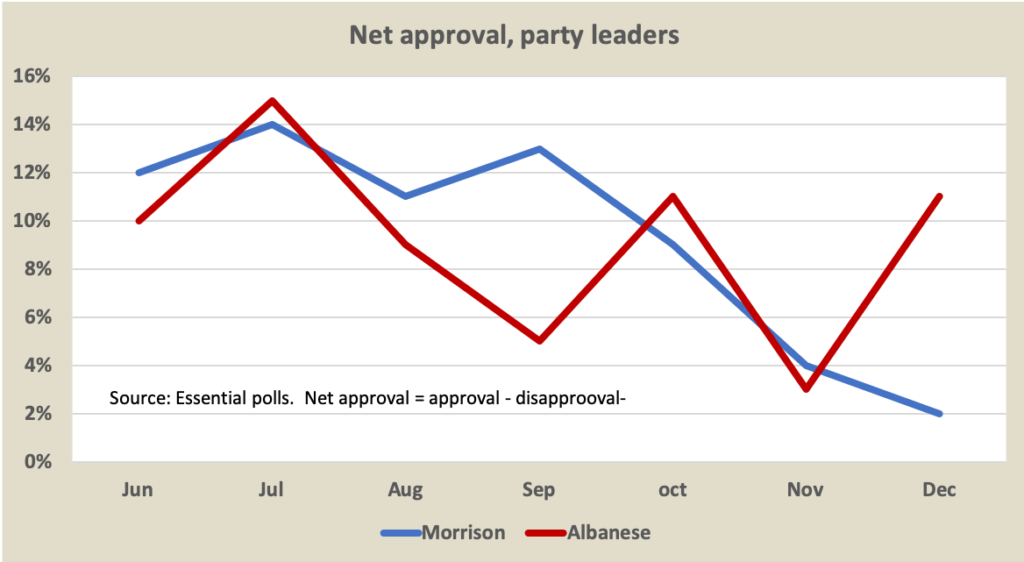 What is probably the last Essential Report for the year starts with leaders’ approval ratings. The chart below shows net approval (approval minus disapproval) for Morrison and Albanese.