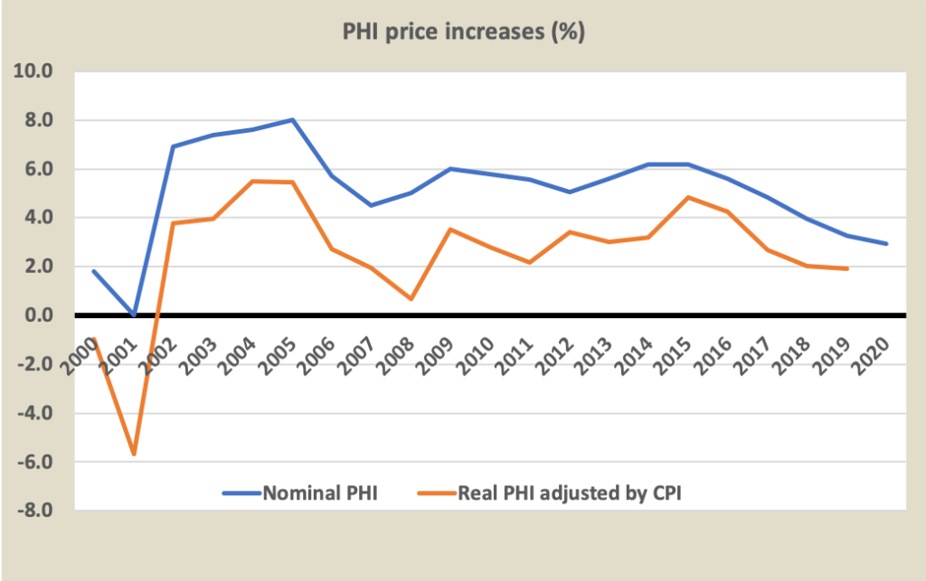 While on the subject of health insurance, below is a chart of premium rises allowed by successive Australian governments. Lowest in 19 years as the government claims? Only if you disregard inflation.