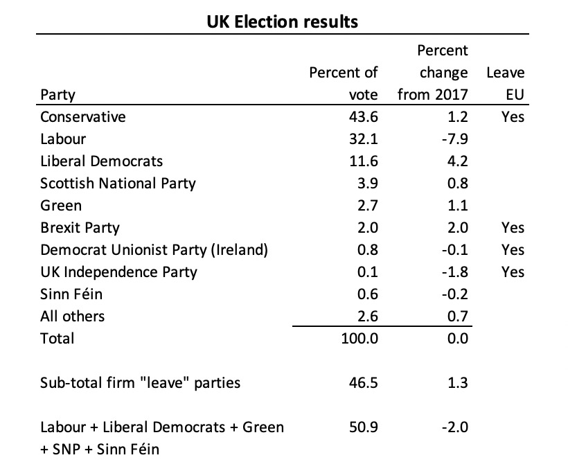 As explained by Amanda Taub, writing in the New York Times, Johnson’s victory is due to a successful marginal seat campaign and, above all, to the way Britain’s first-past-the-post system has given the Conservatives a disproportionate parliamentary advantage. Columbia University’s Jeffrey Sachs, writing in Project Syndicate – The UK’s electoral system failed – writes “If the UK had a national proportional vote system, as almost all of continental Europe does, it would be heading for a second Brexit referendum and staying in the EU”.