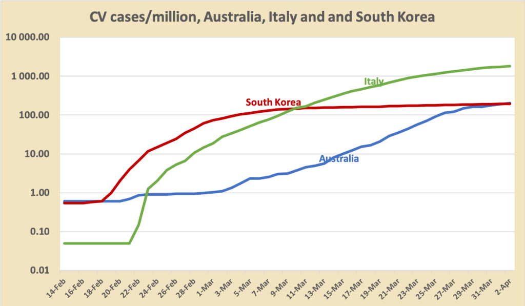 If, like South Korea, we had two cases per million nationally, NSW would have fewer than twenty new cases daily, Tasmania about one. Assuming one in ten needs hospitalisation that would be a manageable case load. Italy’s daily rate of new cases is now around 80 per million and ours has been around 13 over the last week, but it will be at least two weeks before we could say Italy or Australia are on the way down, even though politicians who goofed off in their high school maths classes may make premature and misleading claims. Note that we lack reliable data on the number of asymptomatic transmitters of the virus.