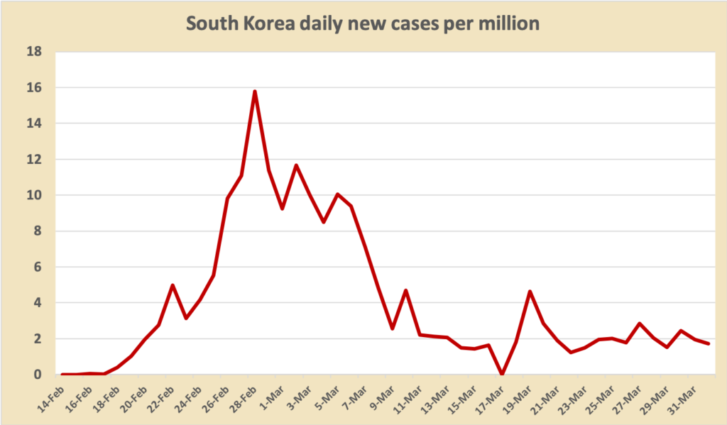 And South Korea’s daily rate of new cases: