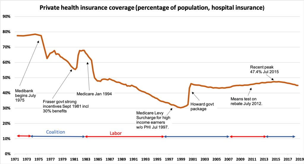 In a paper prepared for a Canberra U3A group, John Kerin, who was a Member of Parliament in the Whitlam Government and who served as a minister in the Hawke-Keating Government, describes the struggles Labor went through to establish publicly-funded health insurance – first Medibank and then its resurrection as Medicare. “People are wasting their breath if they try to convince me that the conservative side of politics is not intent on wiping out national health insurance” he writes. The struggle is captured, in part, in the graph below. (Is Labor in 2019 so strongly committed to Medicare?)