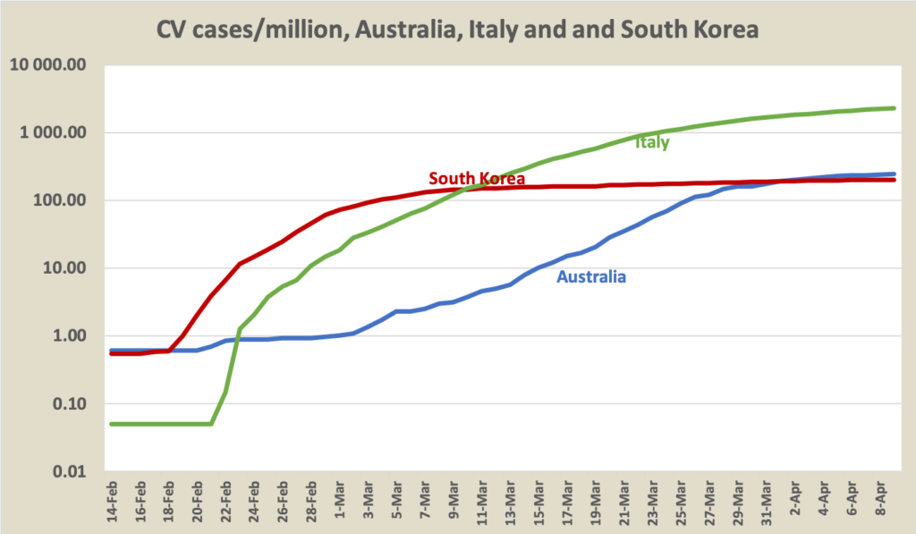 We have been presenting the accumulation curves for Italy, South Korea and Australia. Another week’s data shows a continuation in the trend – flattening in South Korea and Australia, still rising in Italy.