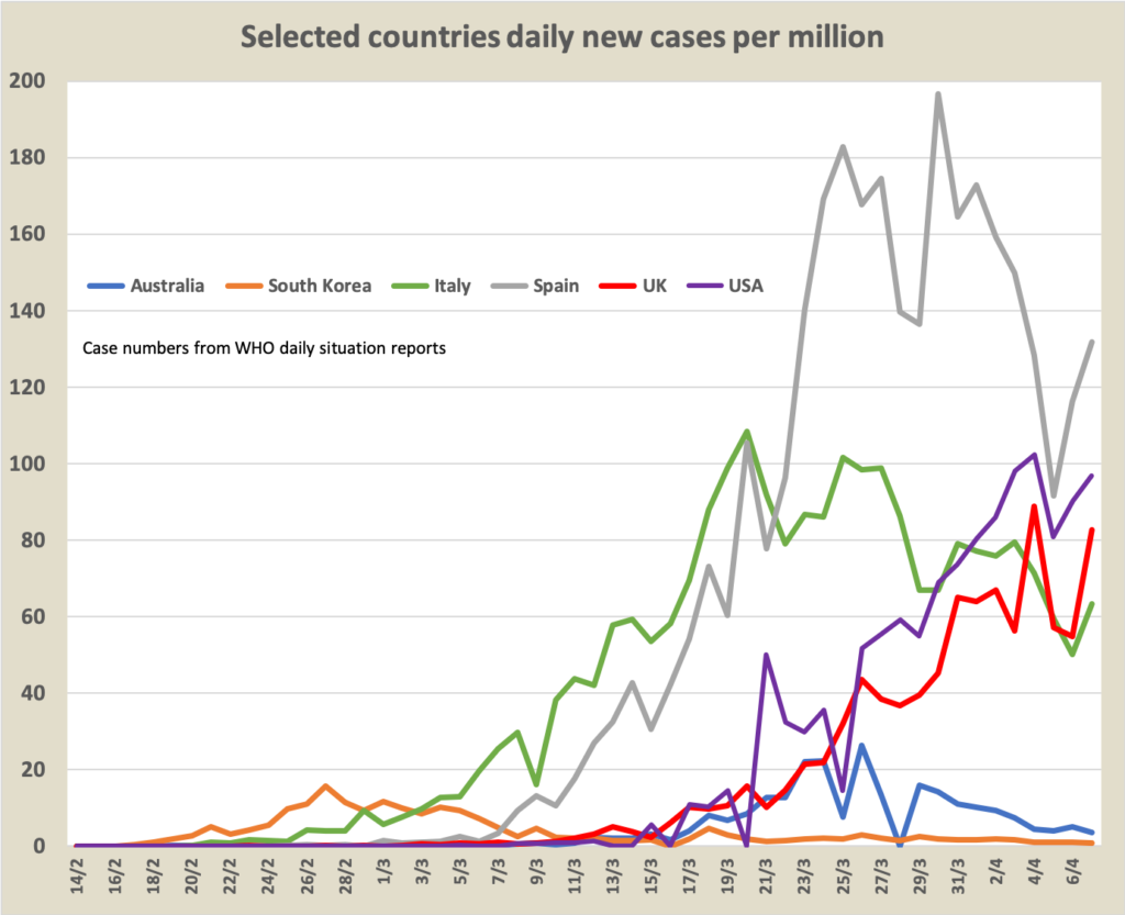 It appears that Italy and Spain may at least be holding back the growth of new cases, but at very high levels. The UK and the USA still seem to be on an upward trend: the US curve looks similar to the Italian curve three weeks ago. South Korea’s curve is so low as to be barely discernible: it’s that orange line running just above the axis. Over the week to April 9 South Korea has averaged 1.4 new cases per million people. Our new case rate over that same week has been 7.6 new cases per million people, and falling.