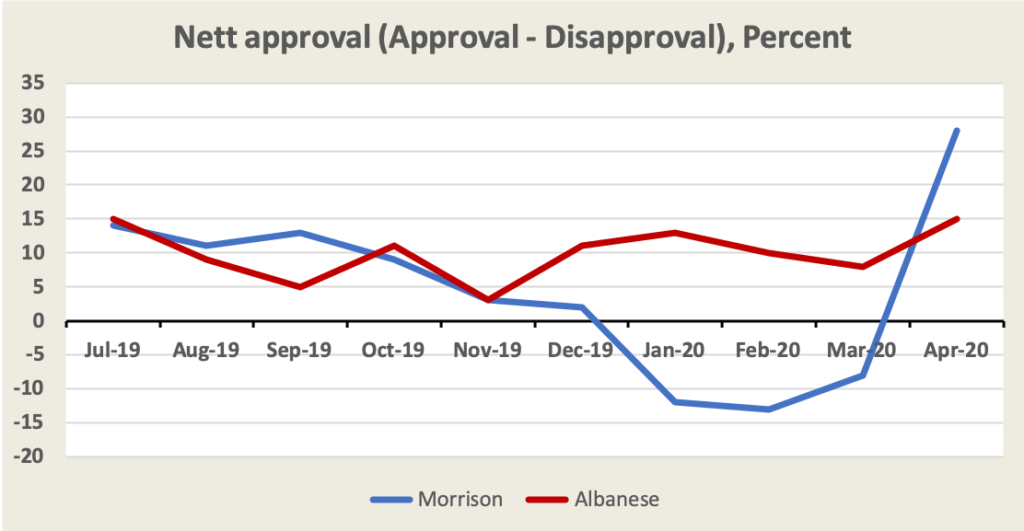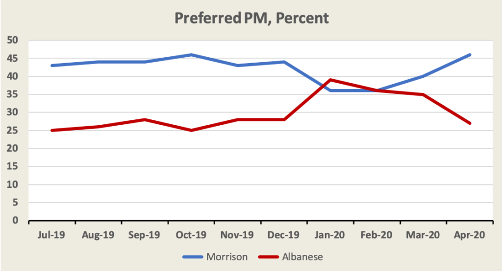 The two graphs below summarise Morrison’s and Albanese’s ratings. Both have enjoyed a rise in approval, but Morrison’s surge is bigger, and he has increased his lead as preferred prime minister.