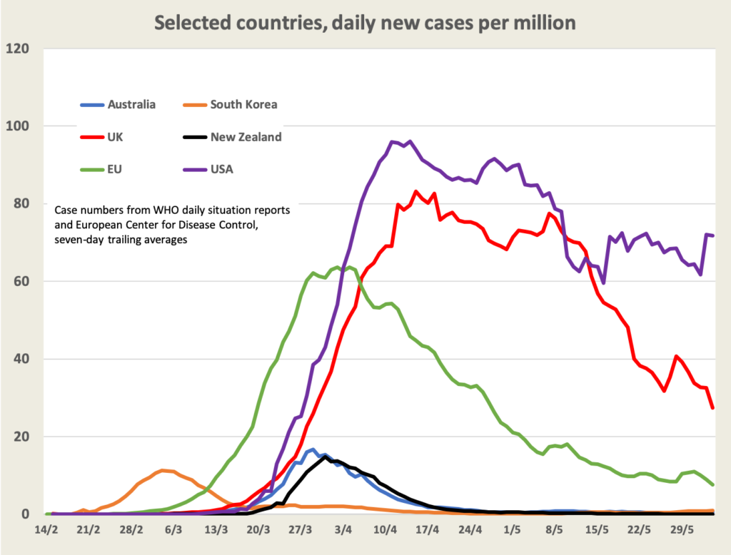Below is the updated set of country curves. America’s curve is on a slow downward trend, interrupted by outbreaks: the protest gatherings will probably lead to another spike in two or three weeks. The EU countries continue to make progress: the EU as a whole has a daily infection rate of 8 new cases a day per million people. But for the influence of Sweden, where infections are running at 79 new cases a day per million and rising, the EU rate would now be down to 6 new cases a day per million. After having defended Sweden’s lax approach for so long , state epidemiologist Anders Tegnell (think of a Nordic version of Brendan Murphy) has admitted that they got it wrong.