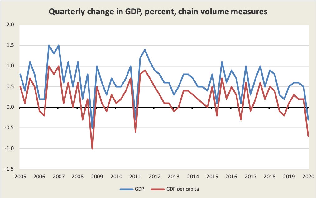 Not yet by the common definition of a recession, which requires two quarters of “negative growth” (econospeak for “decline”) in GDP, and we have had only one so far, in the March quarter, and that was touch-and-go – GDP fell by only 0.3 per cent. That’s because in January and February we were hardly aware of the coronavirus, and the economy seemed to be ticking along: in fact it wasn’t until mid-March that we started to take the coronavirus seriously. Therefore the lockdown would have influenced GDP figures for only two of the thirteen weeks in the quarter. This means either that the lockdown effect was really severe, or that the economy was already doing poorly because of the bushfires and longer-term structural weaknesses.