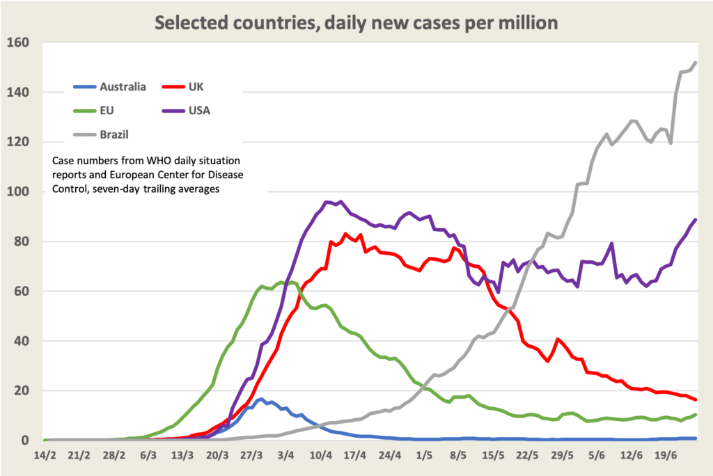 In the EU after two months of reduction (suggesting a reproduction figure R less than 1.0), progress seems to have stalled, and infections may be on the rise again. Their relatively flat line over the last month suggests that R is about 1.0, but that’s a dangerously unstable equilibrium: R has to be brought down to a level well below 1.0 if the virus is to be contained. Some small countries such as Estonia, Finland and Ireland have brought their rates down to very low levels, but others are struggling. If EU countries are to make further progress they will probably have to make stronger moves to control specific outbreaks, as Germany and some other countries are doing.