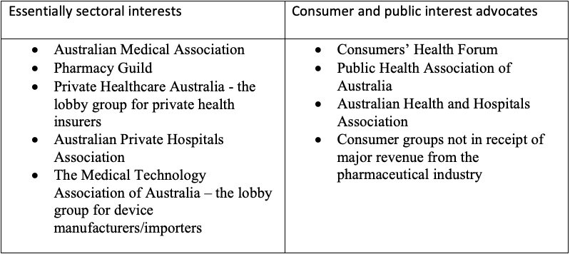 economists use to describe this behaviour — some do advocate for consumers and the public. The table classifies key Australian health sector interest groups into the two