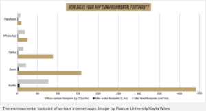 Messy bedroom. Bad hair day. Eating spaghetti. All good reasons to turn your camera off during Zoom meetings. Saving the planet is another one. Data processing requires a lot of electricity and one hour of videoconferencing or streaming can create 150-1,000 grams of CO2 emissions, use 2-12 litres of water and require land area equivalent to half an A4 sheet of paper. Leaving the camera off and reducing the streaming quality reduces these footprints by around 90%. The graph below demonstrates the big differences in the various apps’ environmental footprints.