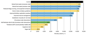 The authors also calculated the potential of producer- and consumer-driven changes to reduce the number of deaths (and the illness and disability that precedes death) related to PM2.5. Effective nation-wide changes (see graph above) included dietary shifts (e.g. reduced calorie intake, substituting poultry for red meat and going vegetarian or vegan), reducing food waste occurring during production and distribution and in households, better management of fertilizer application and livestock waste, and reduced tillage and burning. These changes would also have advantages for global warming and land use. Needless to say, the US livestock industry rubbished the research …