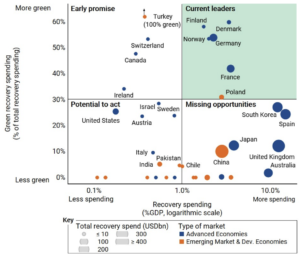 The world’s fifty largest countries announced US$14.6tn of COVID-related spending during 2020. The vast majority was for ‘rescue’ efforts (such as JobSeeker/Keeper and reduced price meals and airfares) but of the US$14.6tn, 13% (US$1.9tn) was directed to long-term ‘recovery’ measures. So, ‘Are we building back better?’, the title of a recent analysis, is a timely question. Unfortunately the answer is not reassuring: only US$341bn (18% of the 1.9tn; 2.5% of the total COVID-response dollar) was for green recovery initiatives. Australia committed approximately 10% of our GDP to recovery measures and is in a group of four with Spain, South Korea and the UK that were well ahead of the rest. However, the percentage of Australia’s total recovery spend that was committed to a green recovery (approximately 3%) was one of the lowest. This places Australia very firmly in the group of countries that is missing opportunities to stimulate a green recovery in the areas of energy, transport, building upgrades, energy efficiency, research and development, and natural capital (see figure below). The last category includes investments in public parks, green spaces, tree planting, reforestation and ecotourism and is claimed to have the advantage of providing lots of jobs for low skilled people, increased resilience against pandemics and natural disasters, reduced air pollution and strengthened biodiversity.