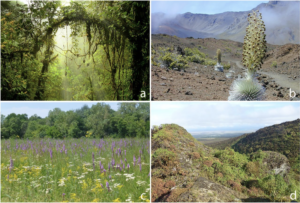 Returning to insects, the photos below show four fragile insect-important communities that are challenged by global change: (a) cloud forest in Costa Rica (the threat is rising temperatures leading to more cloud-free days and longer droughts); (b) Silversword grove in Hawaii (climate changes reducing water availability); (c) Tailgrass prairie in Illinois (agriculture and insularisation); (d) ferns and sedges in the Galapagos Islands (invasive species).