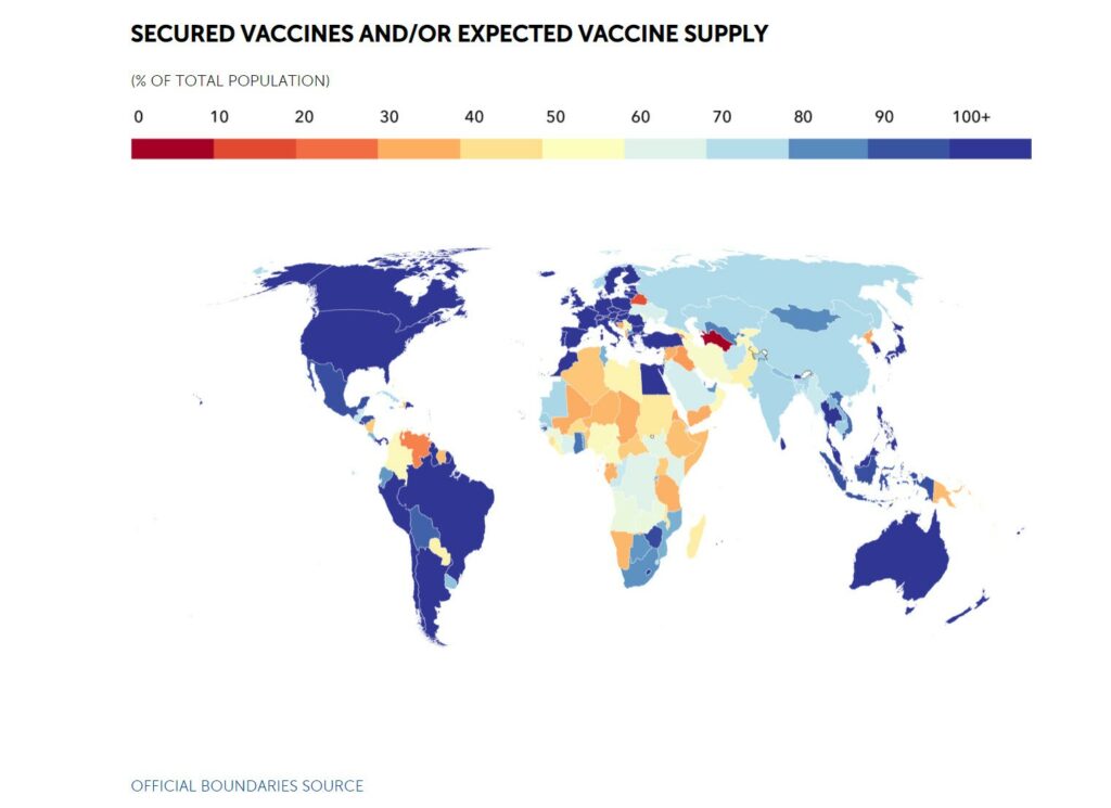 This chart by the Launch & Scale Speedometer (Duke University) shows which countries have procured vaccine doses (confirmed doses). Again, HICs have the largest number of confirmed doses.