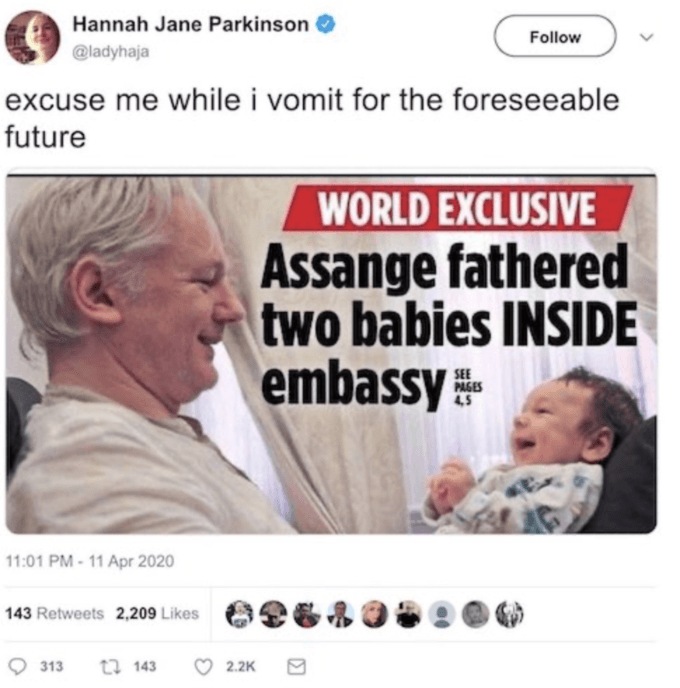But among the Guardian’s own columnists, even its supposedly leftwing ones like Gorge Monbiot and Owen Jones, there has been blanket silence about the hearings. In familiar style, the only in-house commentary on the case so far is yet another snide hit-piece – this one in the fashion section written by Hadley Freeman. It simply ignores the terrifying developments for journalism taking place at the Old Bailey, close by the Guardian’s offices. Instead Freeman mocks the credible fears of Assange’s partner, Stella Moris, that, if Assange is extradited, his two young children may not be allowed contact with their father again.