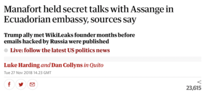 Harding’s 2018 story about Manafort was meant to add another layer of confusing mischief to an already tawdry smear campaign. But problematically for Harding, the Ecuadorian embassy at the time of Manafort’s supposed visit was probably the most heavily surveilled building in London. The CIA, as we would later learn, had even illegally installed cameras inside Assange’s quarters to spy on him. There was no way that Manafort and various “Russians” could have visited Assange without leaving a trail of video evidence. And yet none exists. Rather than retract the story, the Guardian has gone to ground, simply refusing to engage with critics.