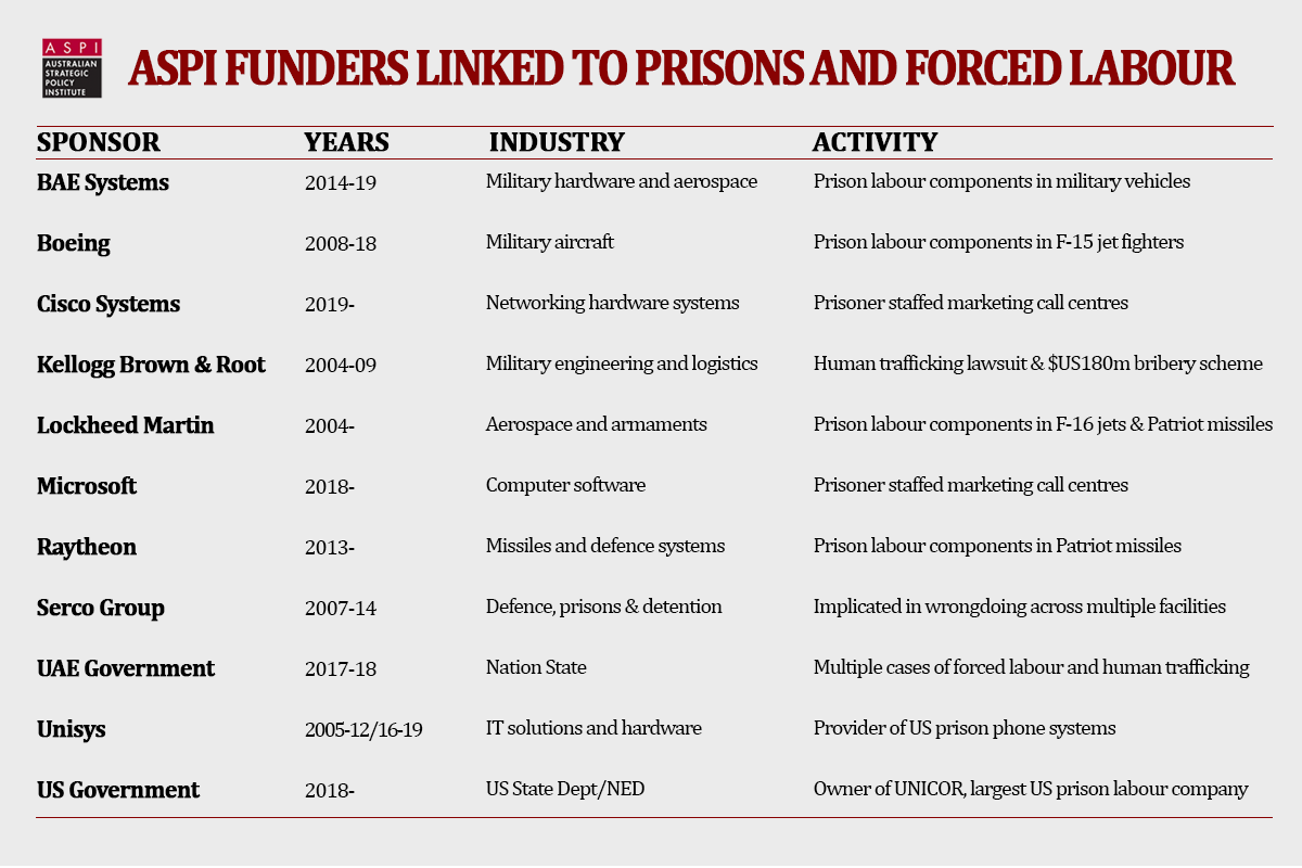 ASPI sponsors Raytheon and Lockheed Martin directly benefit from prison labour that produces electronic components for the Patriot surface-to-air missile.